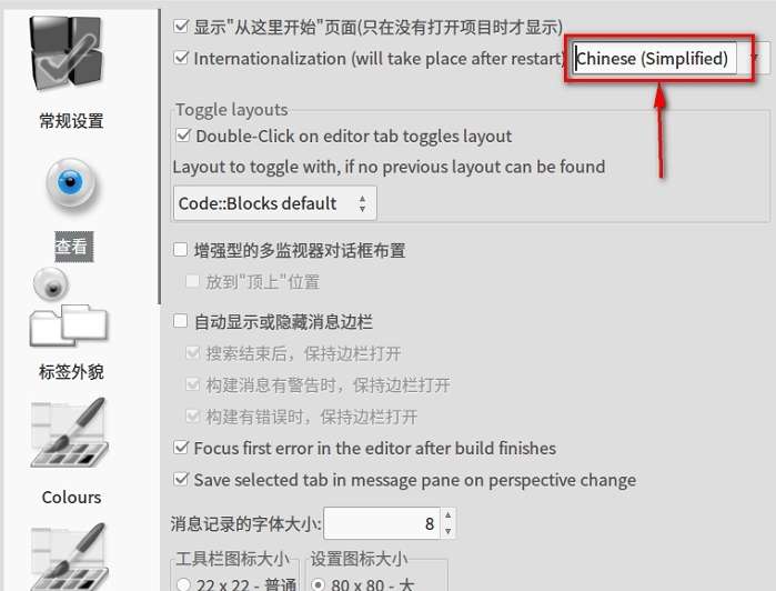 2、然后在codeblocks 的setting-->viwe-->Internationlization 下选择chinese(simplifield),;
