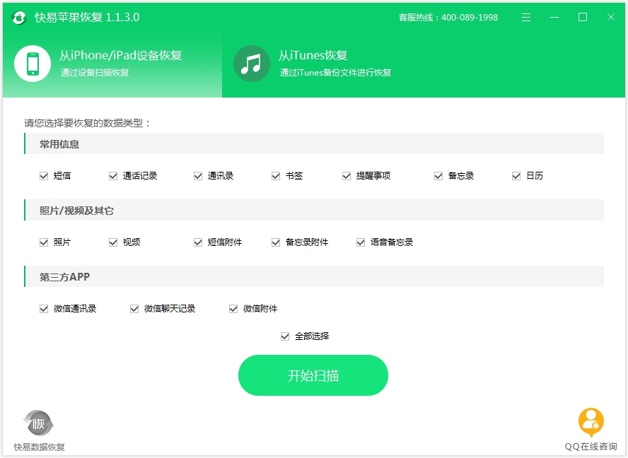 快易苹果恢复官方版是一款很优秀的苹果手机数据恢复器。快易苹果恢复最新版给用户带来了友好的体验和直观向导操作,您只需三步骤即可恢复数据,即使您不熟悉也可以轻松通过电脑操作找到丢失的数据,快易苹果恢复可以恢复iPhone/ipad/iPod的丢失数据,包括照片、视频、通讯录、书签、提醒和日历等。