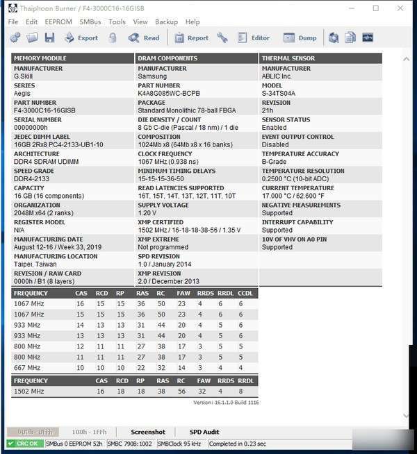 第一列是内存厂家信息,我的是芝奇(G.skill)aegis系列。16G,DDR4 2133,双面(单面8G)