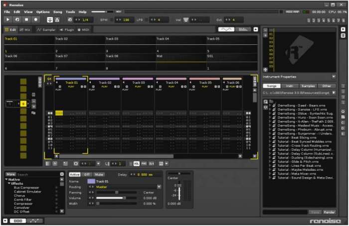 Renoise拥有超过26种原生效果,具备解决任何制作所需的所有必需品:混响,延迟,滤波器,压缩器,均衡器,失真,镶边器,移相器等。尽可能多地使用它们。