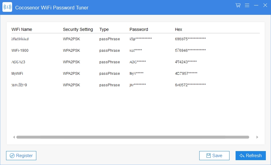 点击“刷新”按钮。所有保存的WiFi密码将显示在界面上。您还可以获得以下详细信息:WiFi名称、安全设置、类型、密码和十六进制。
