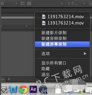 第二,双击打开quicktime软件后,鼠标右键点击软件,弹出菜单栏,在菜单栏中选择新建屏幕录制选项并点击,进入录制界面。