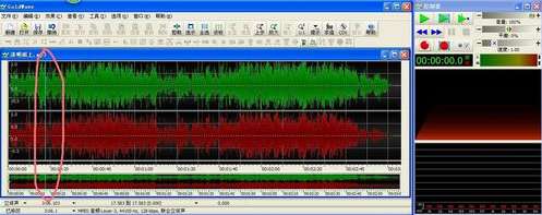 选择要进行编辑的音频文件,打开速度非常快,操作界面也非常清晰,按上中下分布,最上面是菜单命令和快捷工具栏,中间是波形显示,下面是文件属性。我们的主要操作集中在占屏幕比例最大的波形显示区域内,如果是立体声文件则分为上下两个声道,可以分别或统一对它们进行操作。