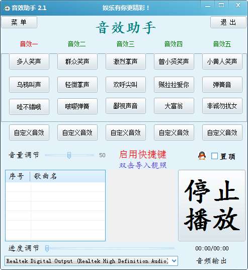 海洋色音效助手官方版是一款专门用于网络K歌、主持、MC喊麦等表演时常用的音效器。海洋色音效助手最新版 能有效的带动现场活动气氛,只需要点击即可播放声音,还支持自定义音效,调节声音大小等。海洋色音效助手官方版带有本地mp3播放器,还支持独立声卡通道输出。
