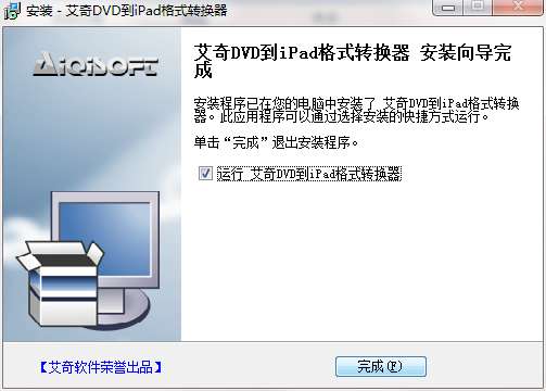 8.点击完成,艾奇DVD到iPad格式转换器软件安装成功