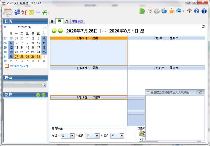 iCal个人日程管理软件官方版是一款好用的时间管理软件。iCal个人日程管理软件最新版可以帮助用户合理安排每天、每周、每月的日程,实现时间管理的概念。iCal个人日程管理软件官方版可按每天、周、月设置日程安排并可设置弹出提醒框,可查询主要地区3天的天气预报。