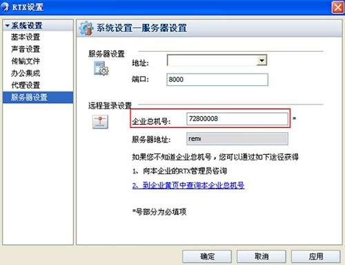 2. 输入“企业总机号码”后点击确定。用远程登陆模式时,服务器地址不用填写。