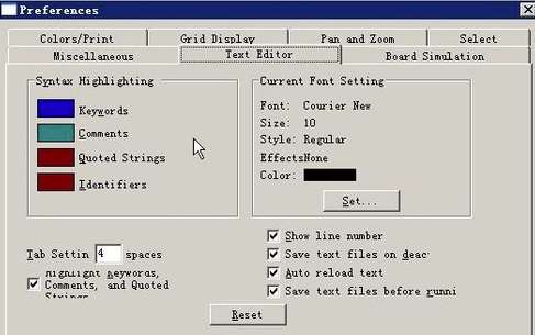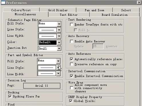 2、要对参数进行个性化设置,首先就是对图纸参数就行修改了。“Options”→“Preferences…”弹出了图纸设置对话框,可以修改“Miscellaneous”“Text Editor”“Board Simulation”“Colors/Print”“Grid Display”“Pan and Zoom”“Select”等七大选项;