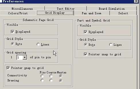 4、Grid Display是设置格点选项,我们可以对格点的显示,显示状态等分别设置,左边的区域是对原理图编辑工作区设置的,而右边部分则是对编辑元件的设置;