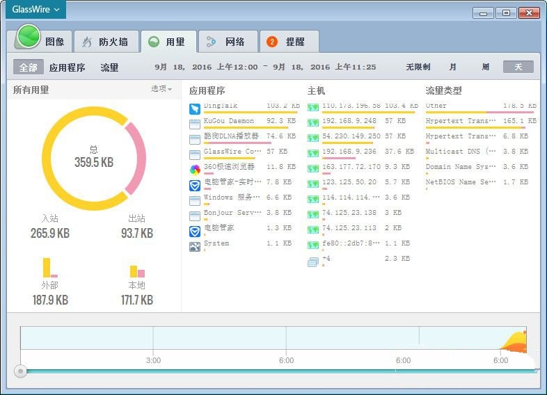 GlassWire 是一个易于使用的工具,可以看到你的过去和现在的网络活动。使用滑块回去的时间和分析过去的网络活动上的图形。检查你的带宽使用按天,周,月和详细解析主机。