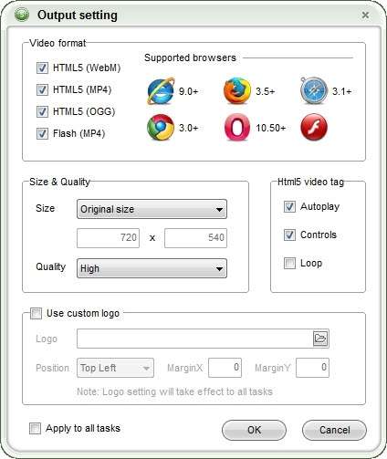 导入视频文件后,单击“更多信息...”按钮以自定义输出设置,例如视频格式,大小,质量,htl5视频标签等。如果您希望输出设置相同,只需选中“应用于所有任务”。