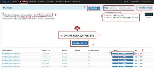 视频上传:点击顶部功能列表的“上传视频”进入如下图界面:
