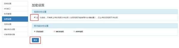 注:加密设置、水印设置只对新上传视频有效。