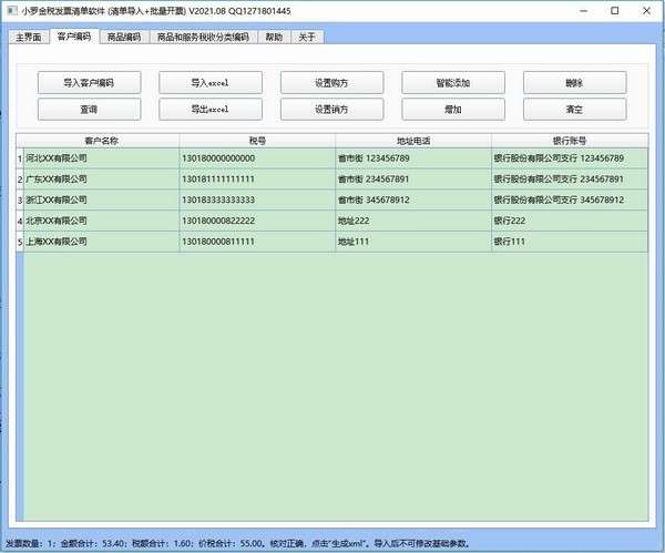 客户信息智能添加:可以直接粘贴 带有 客户名称,税号,地址电话,银行账号的所有信息。可以自动分析增加。支持多种格式。