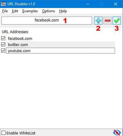 1、下载并解压后,请运行适当的exe文件(x64或x86),然后在URL字段(1)中输入您要阻止的网页的URL并使用加号按钮(添加到列表)
