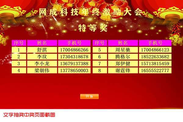 1、支持由数字、字母、中文汉字混合的姓名、手机号、身份证号等各种名单;支持图片照片抽奖;