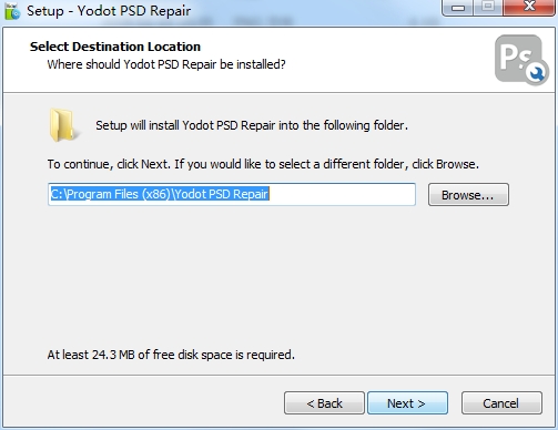 3、系统默认安装目录为C:Program Files (x86)Yodot PSD Repair。用户按“browse”可以选择其他安装目录。确定安装目录后,按“next”。