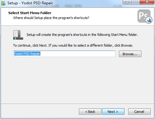 4、确认安装将在开始菜单中创建名为"Yodot PSD Repair"的菜单项,本系统运行的快捷方式存储在该菜单中,选择好后点击『next』: