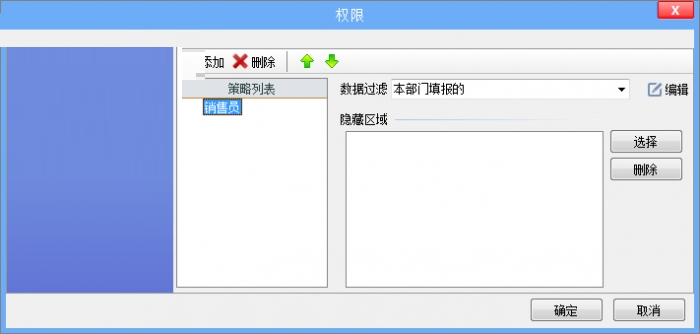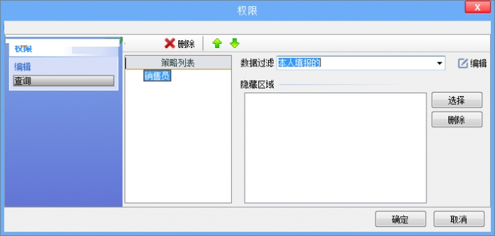 1、点击工具栏【策略】,选择查询,添加角色【销售员】,数据过滤选择“本人填报的”,点击确定,回到设计页面,点击保存。