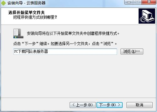 4、设置好所需安装内容后,单击“下一步”按钮,弹出设置程序文件夹操作界面。系统默认的程序文件夹是“云表服务器”在一般情况下不需要做任何修改。
