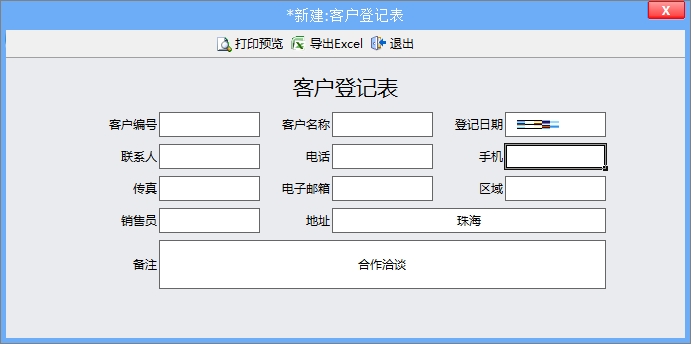 2、单击工具栏按钮【新建】,打开了一张空白的客户登记表,其窗口标题显示为“新建:客户登记表”,当编辑表单时,其窗口标题显示为“*新建:客户登记表”,在新建前面有一个*号,来区别正在编辑的表单和保存过的表单。