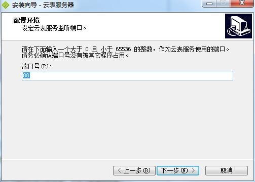 7、输入云表服务的监听端口,这个端口可以在安装完成之后,使用云表服务器控制中心进行更改。