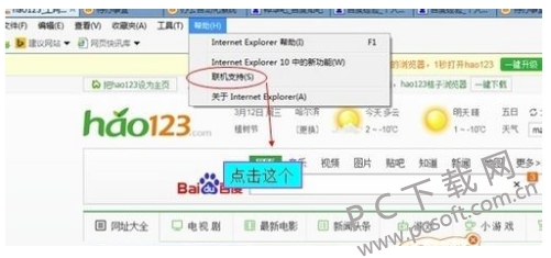 1、 打开IE6.0绿色版后,点击软件顶部工具栏的【帮助】选项,在弹出的选项中点击【联机支持】选项。