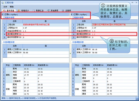 通过比较两份工程文件的基本信息、工程量信息、取费汇总、其他费用及总算表,以明显的颜色标识差异之处,快速查找造价费用差异的原因。