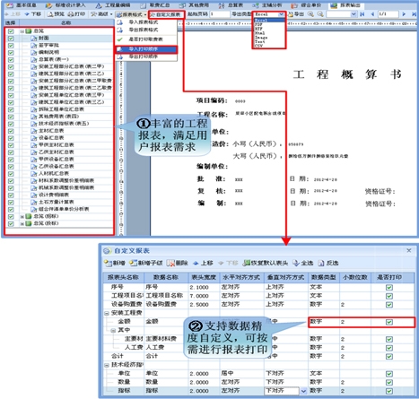 提供丰富的自定义报表格式文件、报表打印顺序格式文件导入导出功能,允许用户设置报表的数据精度、是否打印取费信息、是否显示列、自定义列数据和参数公式等属性,生成多样化的报表,满足用户个性化需求。