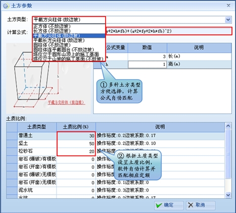 设置参数自动计算生成配电网工程建设中涉及的土方定额,完成坑槽的土方量的计算;根据土质类型,设定不同土质比例自动完成定额工程量计算,避免人工计算误差,提高计算精度。