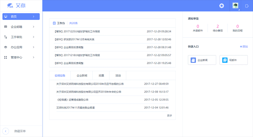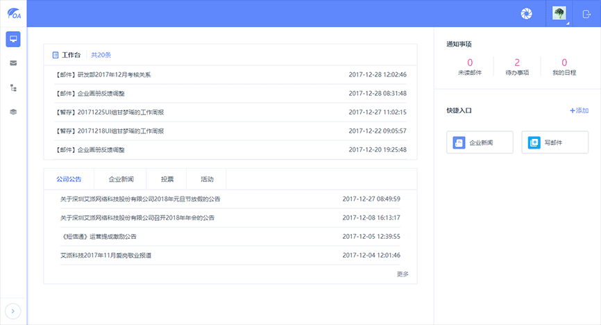 艾办oa电脑版是一款智能的办公管理协助软件,具有最清晰的人员数据安全管理,设置有智能的企业文档下载窗口,及时的通讯目录,带给用户最便捷的沟通交流,还能实现文件互传使用方便,欢迎来体验!