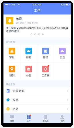 专为移动办公量身打造,推出审批、邮箱、日程、云盘、签到、公告、工作圈、企业新闻活动投票等多样且适用于企业办公的应用, 只为您提供更方便、快捷的工作方式完美解决日常办公和管理问题;