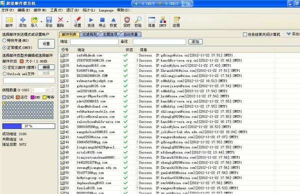 超级邮件群发机适用于各种需要发送邮件到大量地址的应用,如电子报刊发行、邮件列表订阅发送、多客户企业联系、论坛版主、网站管理员等领域;并同时具备邮件地址校验和搜索功能。 是唯一一款按照国际标准 MIME 协议标准封装邮件的群发软件,而且功能之多,功能之强大,没有任何一款群发软件可比。
