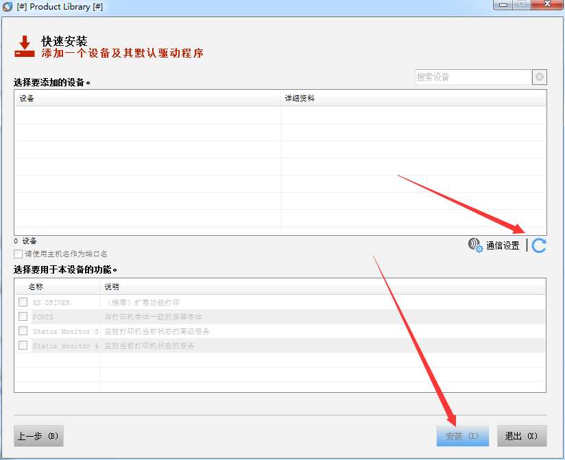 3、打开打印机电源,点击【刷新】,待搜索到设备后,点击【安装】;