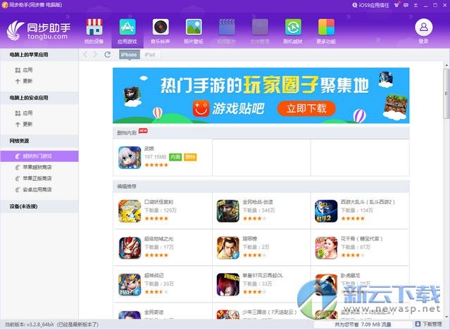 同步助手是一款设备管理及辅助工具,全面支持iPhone,iTouch,iPad的数据与PC同步的软件。你可以用它来管理音乐,下载app,给iOS设备安装ipa和pxl格式的软件,安装过程安全干净,绝对不会造成白苹果。总而言之,它是一款贴心方便的手机助手,在它的帮助下,你能更自由的体验iOS给你带来的奇幻世界,做一个最IN最自由的同客。