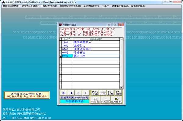 普大流水帐管理系统官方版是一款十分优秀的流水账管理软件,普大流水帐管理系统中文版主要包括拥有摘要片语建立、收支凭证资料新增、收支凭证查询编修、一般报表打印、未来预定收支处理等功能,普大流水帐管理系统官方版可以帮助用户更好的管理流水账事务。