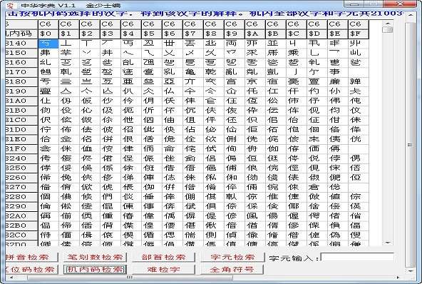 表格中显示全部机内码汉字,按机内码找到所要汉字后双击该汉字,在信息板上显示有关信息(简繁体、拼音、笔划数、部首、机内码和区位码),该汉字复制至剪贴板。