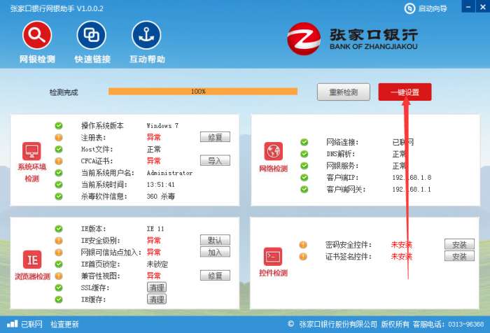 一键修复是通过修复您的电脑上不符合网上银行的相关配置项,安装网上银行所需的相关组件,确保您安全、便捷地使用网上银行