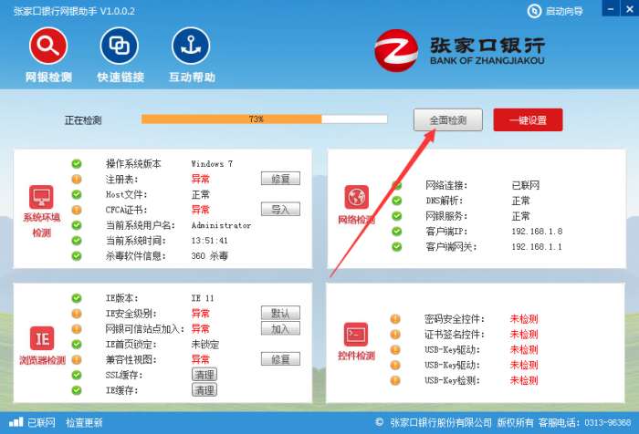 根据网上银行对环境的要求,对您的电脑进行全面的检查,发现并提示其中不符合网上银行要求的系统相关配置项以及是否安装网上银行所需相关组件