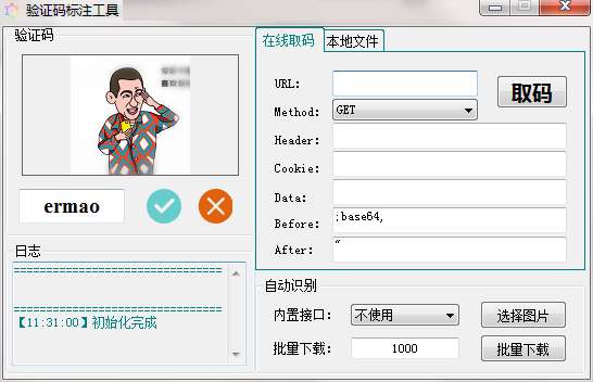 1、支持在线取验证码和取本地文件夹,也可选择单个图片或者把图片拖进软件窗口;