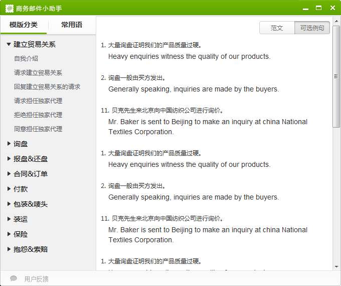 商务邮件小助手是一款功能强大且完全免费的外贸邮件助手软件,拥有非常实用的商务邮件范文和模板,能够帮助外贸人员更好的胜任外贸工作。软件界面简洁美观,拥有建立贸易关系、询盘、报盘还盘、合同订单、付款、包装唛头、装运、保险、抱怨索赔等分类模板,全部是中英文对照,能够帮助外贸工作人员更好的学习和应用。