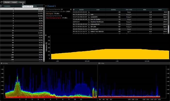 3、查看2.4GHz频段信道使用情况,这是inSSIDer非常有亮点的一个功能(纵坐标:信号强度,横坐标:14信道)。在这里我们不仅可以看到每个无线热点所占用的无线信道,还能看到该热点的信号强度。此时,信号强度强,占用信道不拥挤的无线热点就是你的最佳选择。