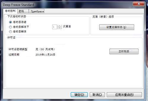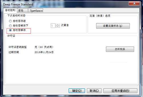 之后就会弹出下列界面,冰点还原的启动控制有三种:“启动后冻结”、“启动后解冻下_次重启”、“启动后解冻”,这三种启动控制也是冰点还原最重要的部分,不同的启动控制状态区别可大着呢。
