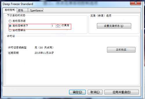 启动后解冻下_次重启:选项框中的数字是可以自由更改的,选择1,意味着电脑重启后1次为不保护状态,以此类推,选择的数字几,就意味着电脑重启后几次内为不保护状态。