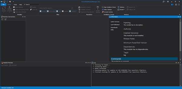 2、还允许您轻松查看模块信息,例如描述、发行说明、版本信息、标签、依赖项和命令。搜索存储库(例如 Power Shell 库)以安装新模块并查看有关该模块的详细信息,以帮助您确定这是否是您需要的模块。
