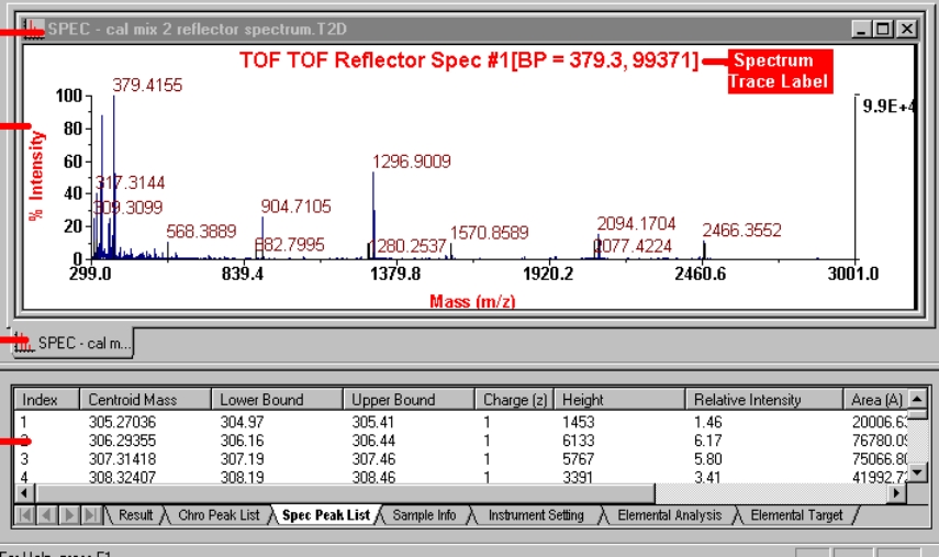 “光谱”窗口显示数据轨迹,并指示光谱中最高峰的基峰(BP)质量和强度