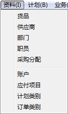 6.资料包括货品、供应商、部门、职员、采购分配、账户等选项,如图: