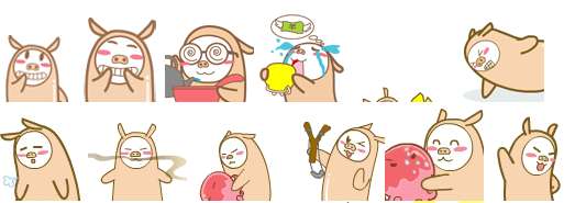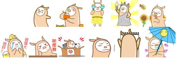 很可爱的一个身体像红肠的小猪猪,尖尖的耳朵。表情有:喝咖啡,捂眼,叫,疑问,含泪,招手,狂吐,寒,BYE,啥!,扣鼻子,跳舞,嘿嘿嘿,转身,help me.吐火,嗅秋风,睡觉,吃棒棒糖,哭着狂跑,踢,求,在床上睡着了,晕,hello!怒火。