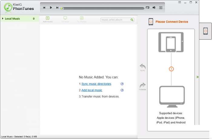 KiwiG PhonTunes最新版是一款十分专业实用的音乐同步软件,KiwiG PhonTunes最新版界面清爽美观,功能出众优异,通过这款软件用户可以在不同设备之间进行快速传输音乐文件,此外,KiwiG PhonTunes官方版还支持iOS、安卓、itunes、PC、USB、外接硬盘等传输方式。