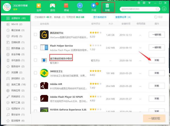 方法三:安装并打开360软件管家,在卸载选项的列表中找到金万维动态域名小助手软件,点击卸载即可